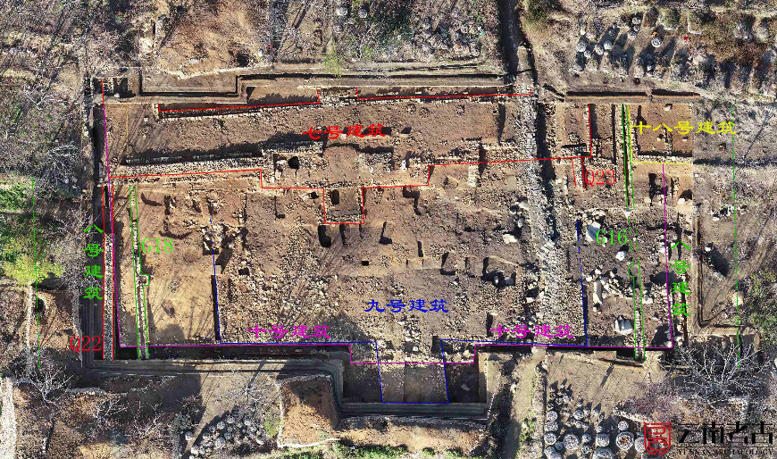七号建筑北侧并列分布有十八号建筑,仅揭露建筑一角,具体结构布局不明。2019年勘探时,在七号建筑南侧亦发现有建筑基址。七号建筑东南角、东北角分别有两道石墙(Q22、Q23),石墙连接七号建筑并继续向东延伸。
