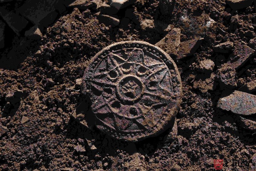 天井东侧及南北两侧均为廊道,廊宽5米。廊道外侧均垒砌厚约1米的石墙,沿墙分布有间距4.1-4.2米的磉墩,部分磉墩填充有竖向抱合的板瓦。廊道内侧采用石块围砌成边,沿边亦分布有与外墙磉墩相对应的圆形磉墩。东廊内侧边从下往上分成三层台阶状,似经多次修缮或重建。南北廊道对称分布,自东往西沿地势呈斜坡状抬升,与天井西部的正殿相连。正殿处于高台之上,勘探发现正殿以石块垒砌成石墙,南北两侧有回廊,回廊以青砖和绿釉方砖铺砌地面;绿釉方砖规格为30×30×3.5厘米,青砖规格为37×15×4厘米。七号建筑门廊、正殿处均发现有大量的瓦砾堆积,门廊处堆积内发现有莲花纹、兽面纹及法轮纹瓦当。门廊倒塌堆积内发现的板瓦长36-40、宽19-25厘米,筒瓦通长38-41、唇部长5-7、直径13-15厘米。